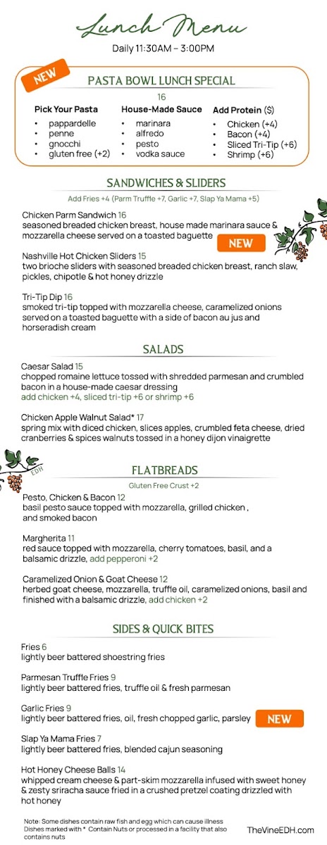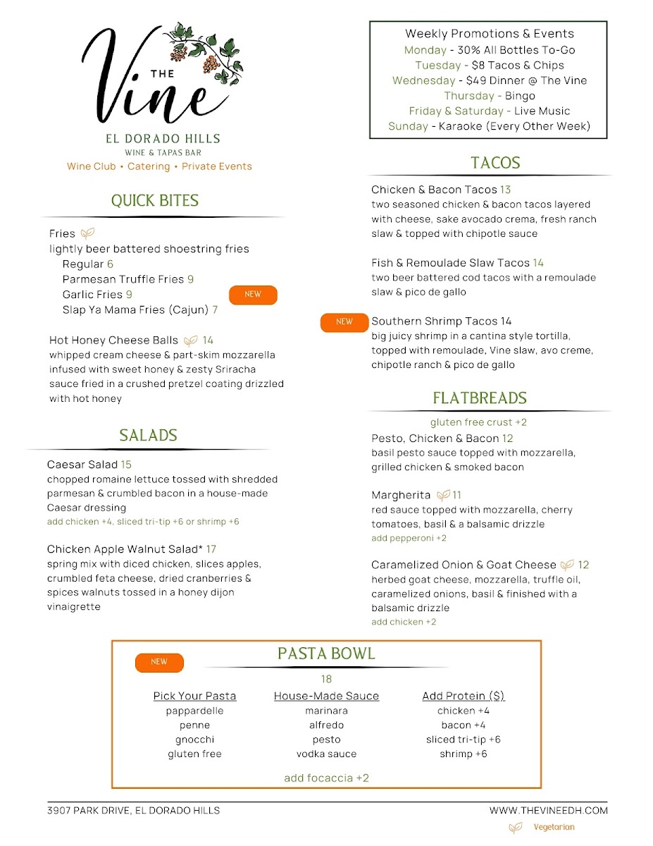 The Vine El Dorado Hills Menu invites you to take things slow and enjoy flavors that feel both familiar and elevated. Located at 3907 Park Dr in El Dorado Hills, this spot mixes laid-back California charm with Mediterranean touches, so every dish feels like a little escape. You’ll notice how the plates move from small bites that are easy to share to heartier entrées that are perfect when you’re ready to settle in. Think crisp flatbreads, fresh salads, and pastas that hit that comforting sweet spot without feeling heavy.